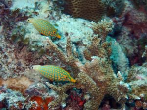 今年はサンゴ白化でサンゴ依存の魚は・・・・・ここでは比較的サンゴあるのでテングカワハギさん💛