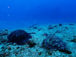 マダラエイとアオウミガメがならんで休憩中♬カメもデカい